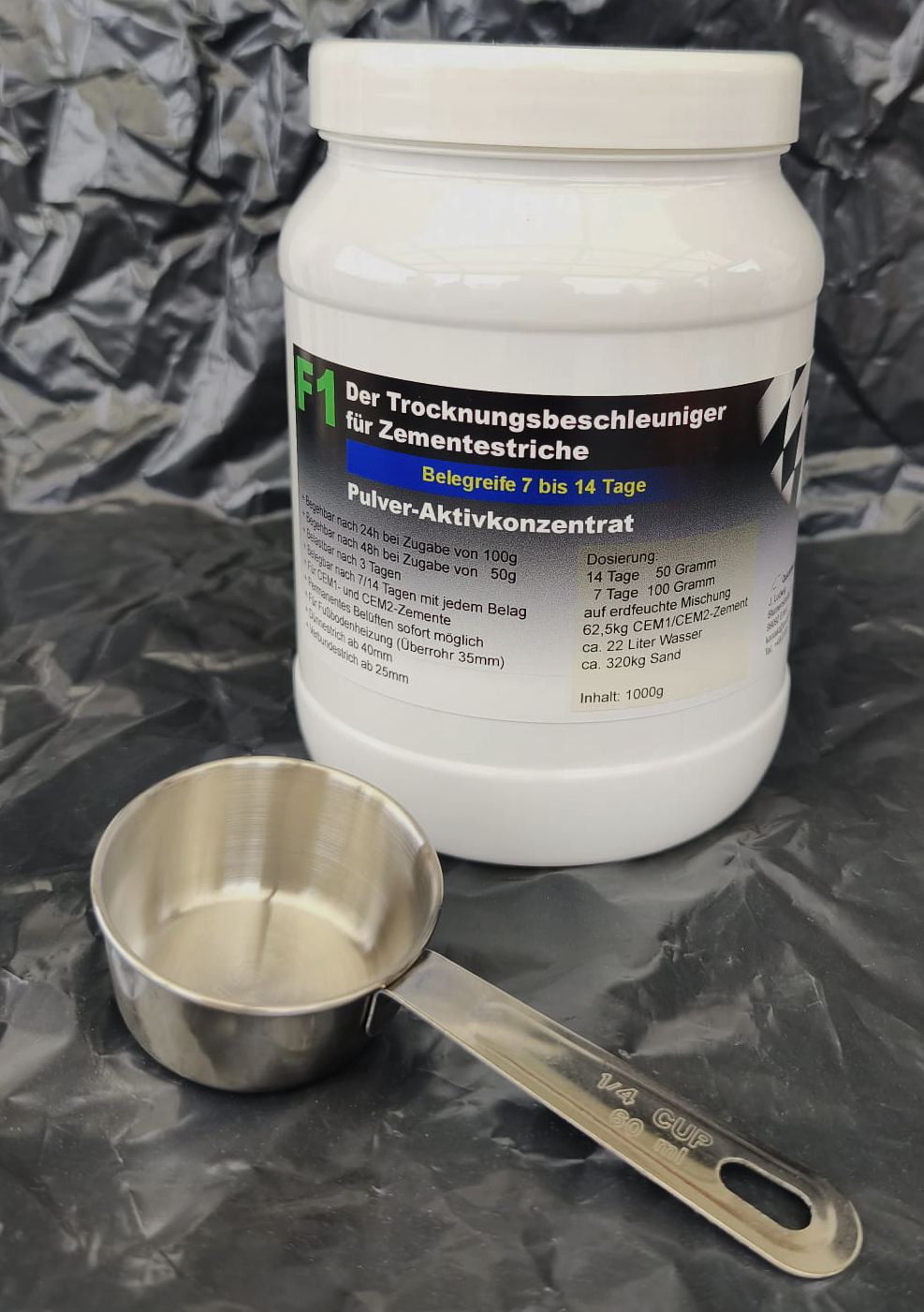Dosiermenge 50g = 60ml. Ein gestrichener Dosierlöffelöffel für eine 200 Liter-Estrichmischung bei 14-Tage-Trocknung. Bei gewünschter 7-Tage-Trocknung bitte 2 gestrichene Dosierlöffel auf eine 200 Liter-Estrichmischung.