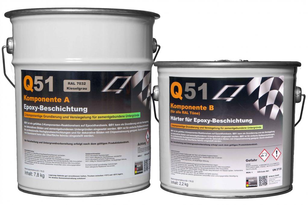 Q51 wird als Grundierung und Versiegelung von Zementestrichen und Betonuntergründen eingesetzt. Q51 schützt zementgebundene Böden gegen mechanische und chemische Einwirkungen. Die Oberfläche kann auch feinrau gestaltet werden, indem man Feinsand in die Beschichtung zumischt. Durch einstreuen von Farbchips, und anschließender transparenter Versiegelung, können dekorative Böden gestaltet werden. Durch die hohe Deckfähigkeit von Q51, ist es auch ein sehr gutes Produkt für Kopfversiegelungen.